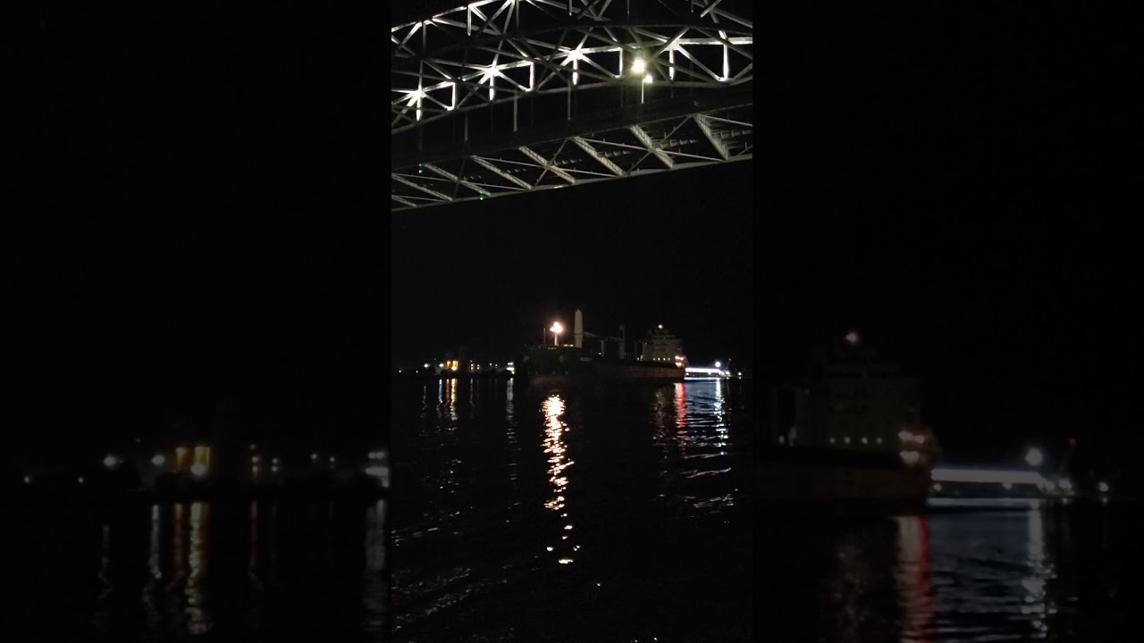 The Ruddy coming under the Blatnik Bridge to depart Duluth|Superior area