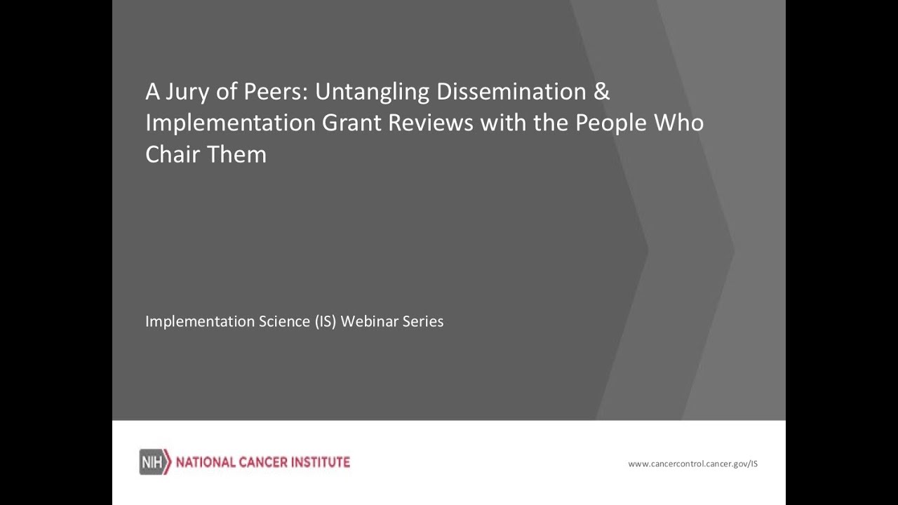 A Jury of Peers: Untangling D&I Grant Reviews with the People Who Chair Them Dr. David Chambers joined by Dr. Stephen Bartels, Dr. Ross Brownson, and Dr. Melissa Simon who have all served as past Dissemination and Implementation Research in Health (DIRH) Study Section ( Chairs and shared insights gleaned from their collective leadership of the peer review committee. The panel delved into how the standard NIH review criteria may be interpreted in the context of DIRH, including how concepts of significance and innovation are considered, and answered, from our participants, a range of questions about the review process through the eyes of those who lead the effort.